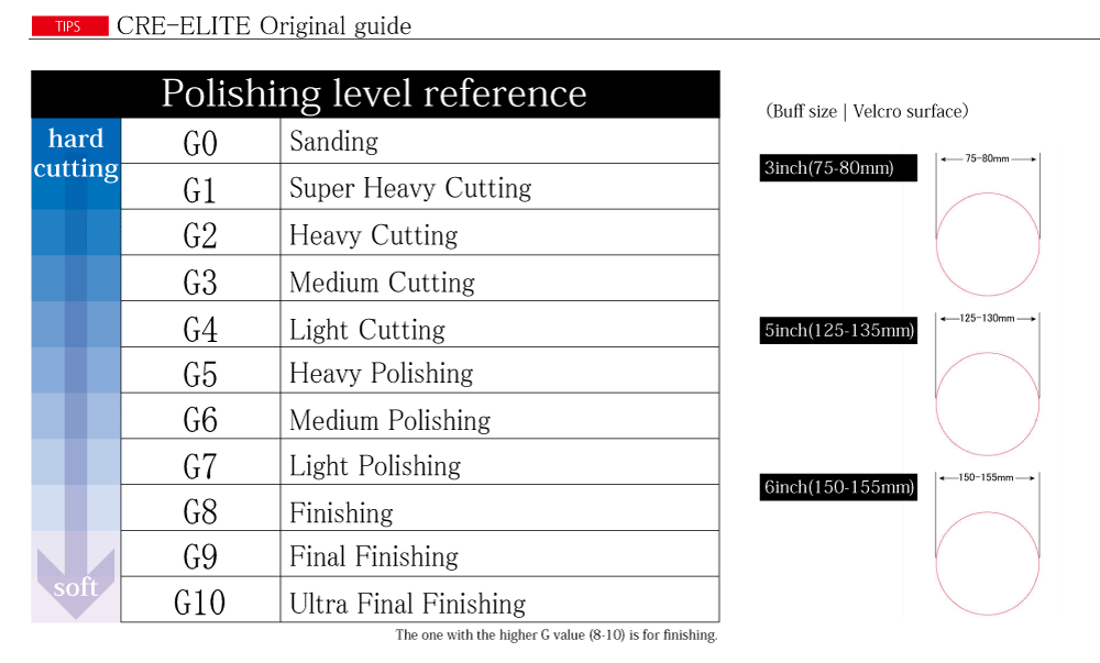 We offer various levels of buffs depending on the purpose of polishing. Please refer to it as it is our own index. The one with the higher G value (8-10) is for finishing.